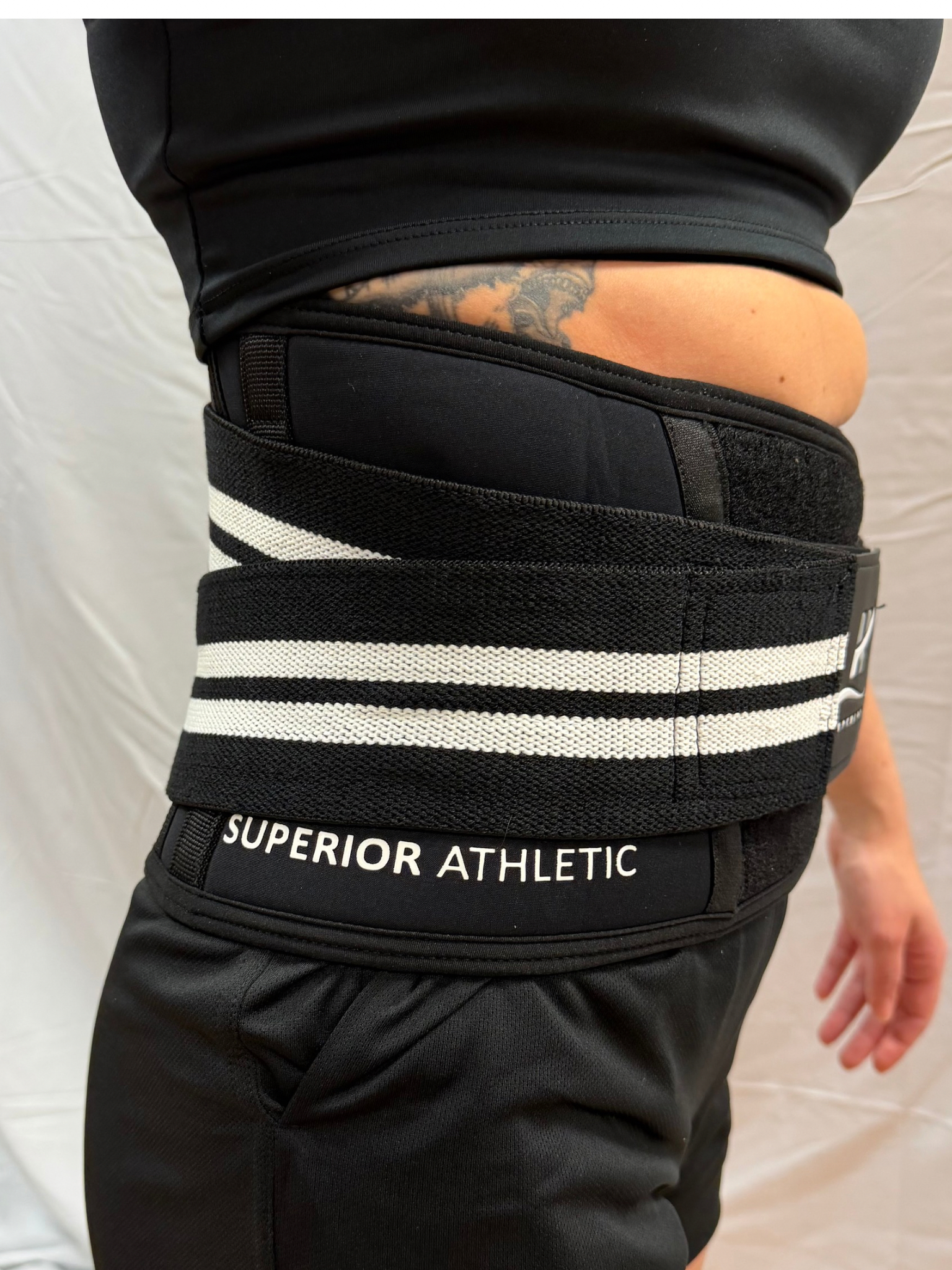 Wrap the neoprene back support belt around your mid-section so the top edge sits roughly at the bottom of your ribs and the bottom edge covers the top of your hips. Close the Velcro front and then pull the elastic straps to your desired tightness. Use a lighter tension for warm-ups and accessory work. For heavy sets and events, tighten the straps more and focus on bracing hard into the belt. If you use a power belt over the top, put the neoprene belt on first, then the main belt.